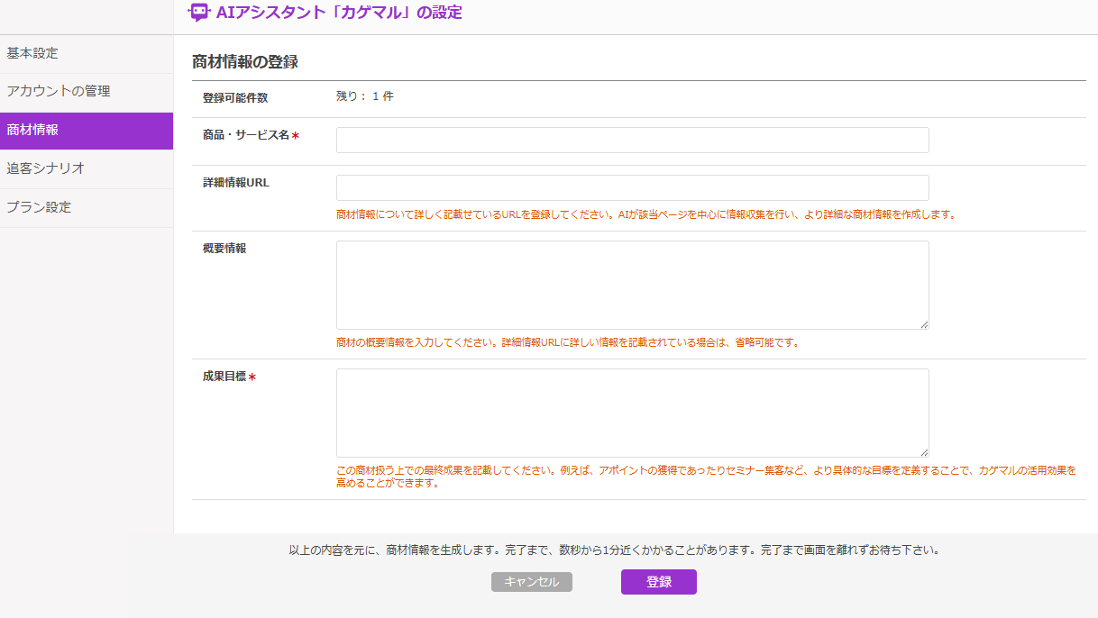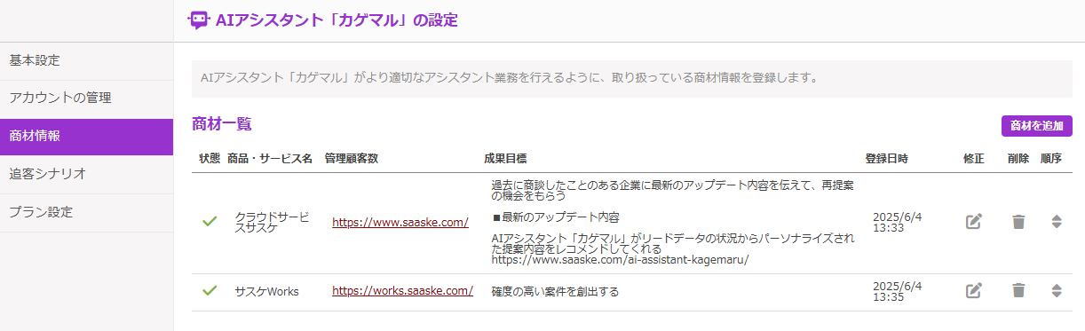 カゲマルAIがより適切なアシスタント業務を行えるように、取り扱っている商材情報を登録できます。