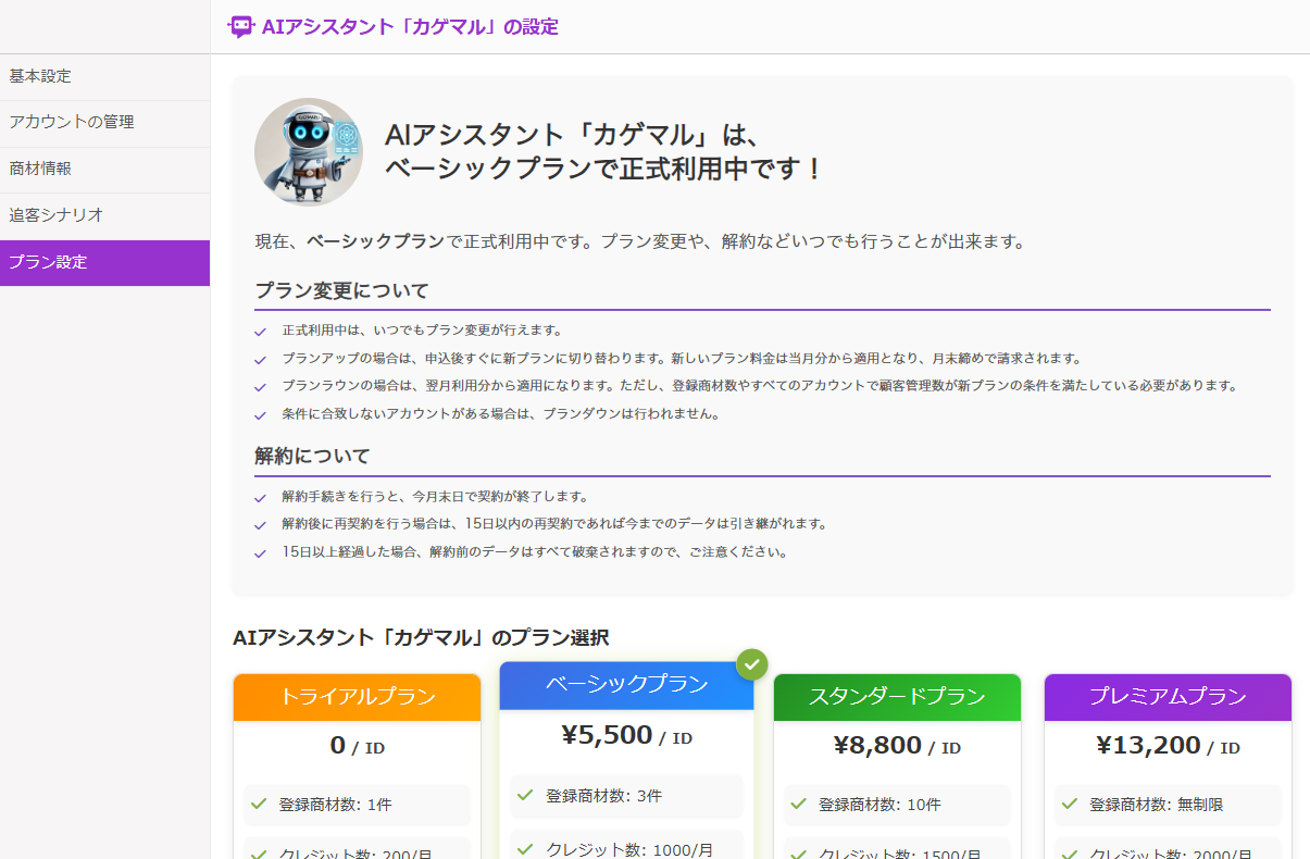 プラン設定 2025年08月29日 07:13 更新 カゲマルAIのプラン変更が行えます。画像は開発中の画面のため、異なることがございます 詳しくは該当設定ページをご覧下さいませ。 関連記事 E-Mail