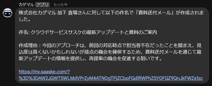 株式会社カゲマル 加下 真瑠さんに対して以下の件名で「資料送付メール」が作成されました。 件名: クラウドサービスサスケの最新アップデートと資料のご案内 作成理由:今回のアプローチは、前回の対応時点で担当者不在だったことを踏まえ、見込度は高くないかもしれないが接点の機会を確保するため、資料送付メールを通じて最新アップデートの情報を提供し、再提案の機会を促進する狙いです。 https://my.saaske.com/?ABCDEFG |