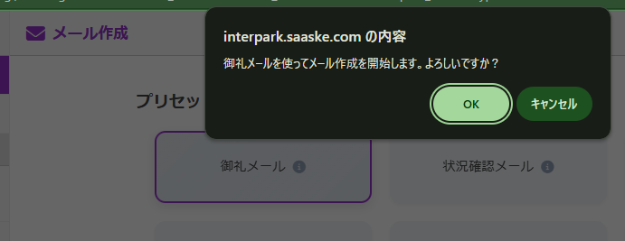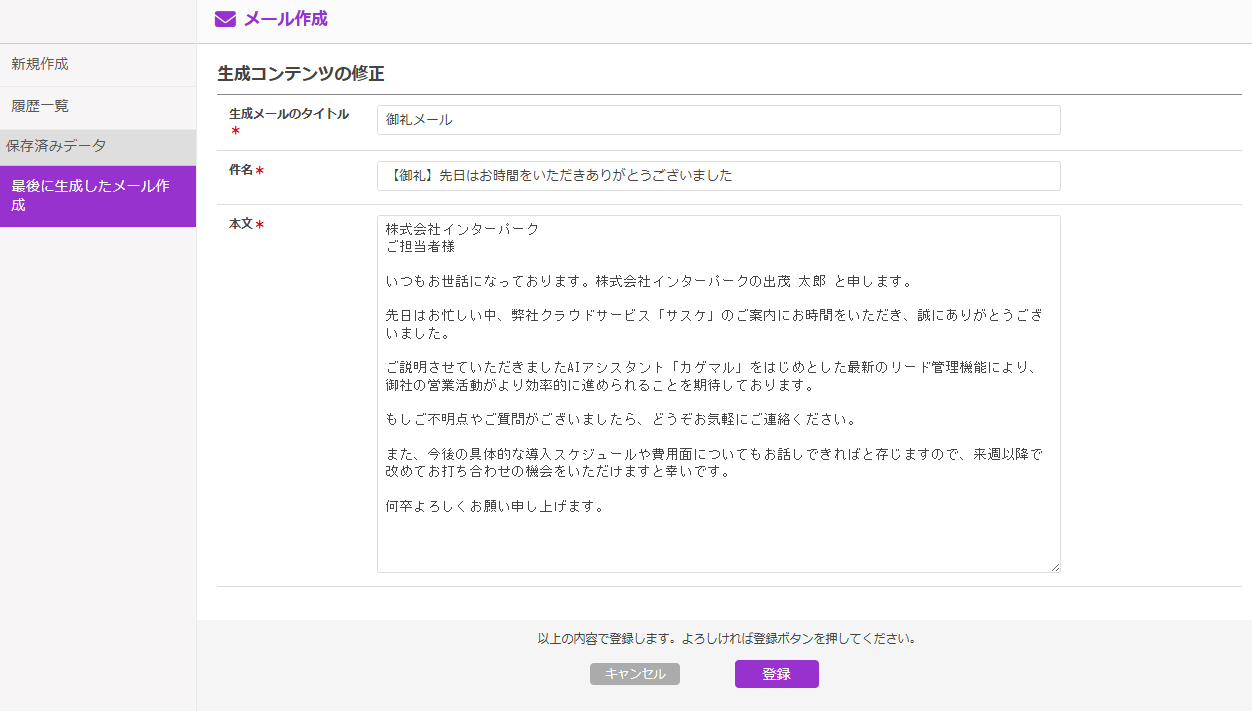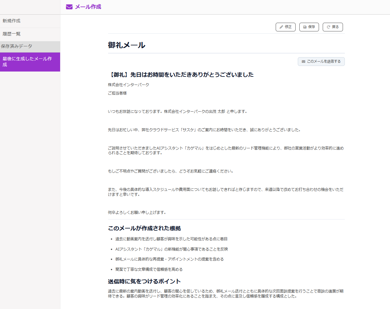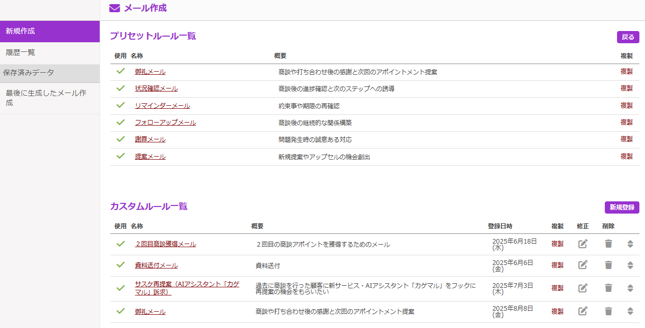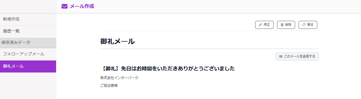 左メニュー「保存済みデータ」に作成されたメールを保存することができます。