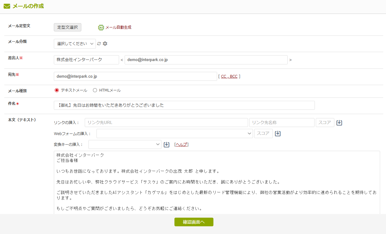 カゲマルAIに、顧客へ送信するためのメール作成を行わせることができます。