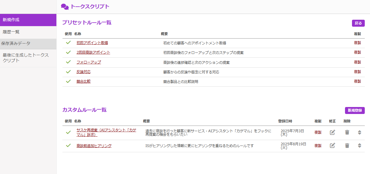こちらをクリックすることで、作成済みのトークスクリプトを改めて修正や保存済みデータの削除を行う事が可能です。