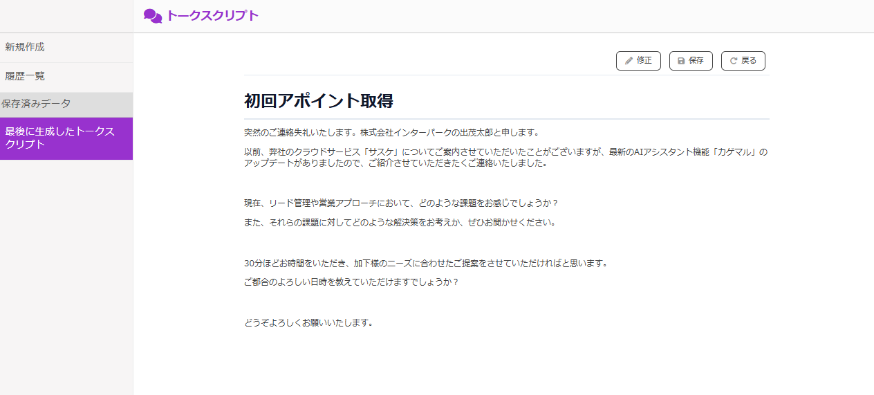 カゲマルAIが作成したトークスクリプトを手直しすることができます。