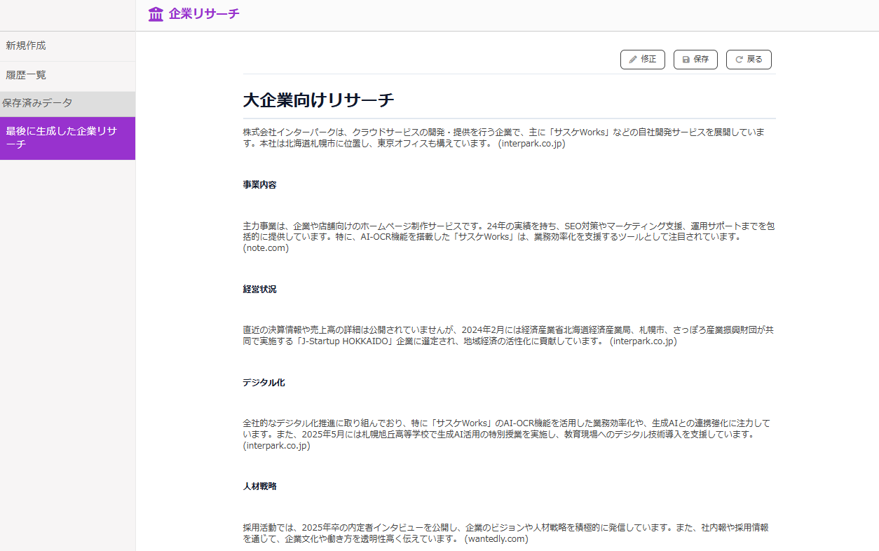 こちらをクリックすることで、作成済みの企業リサーチを改めて修正や保存済みデータの削除を行う事が可能です。
