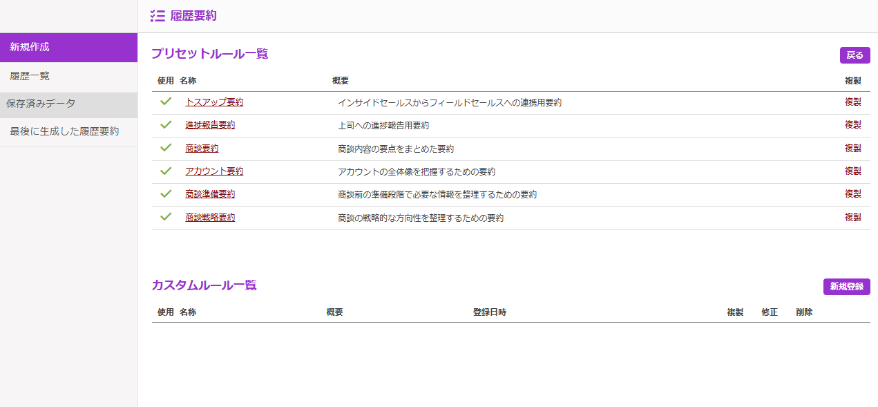 履歴要約のトップ(ルール選択画面)に戻ります。