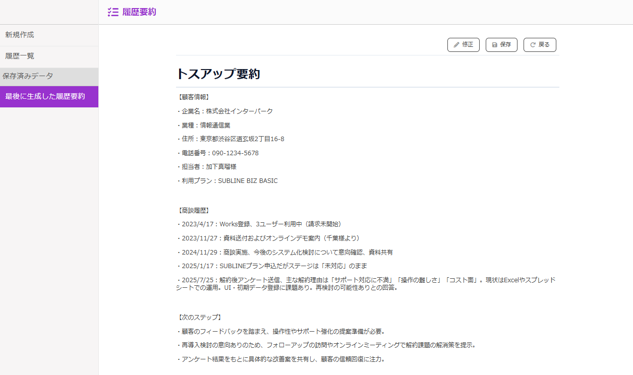 カゲマルAIが作成した履歴要約を手直しすることができます。