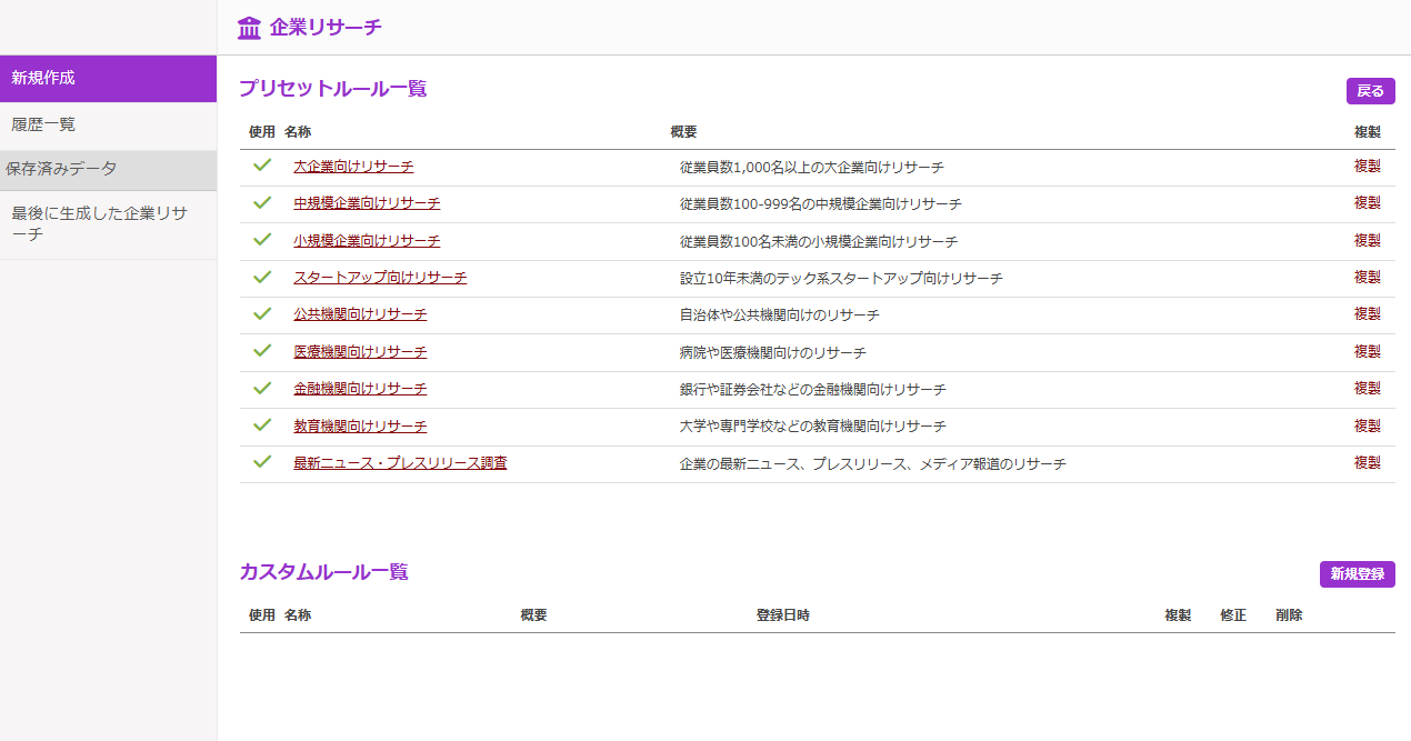企業リサーチのトップ(ルール選択画面)に戻ります。