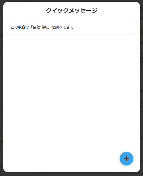 クイックメッセージのウィンドウに表示されている から、カゲマルAIに送信したい質問や指示を保存できます。保存したタイトルをクリックすることで、簡単に質問や指示を送信できるショートカットとなっています。