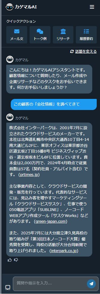 カゲマルAIに質問したい内容、指示を入力することでAIが回答してくれます。