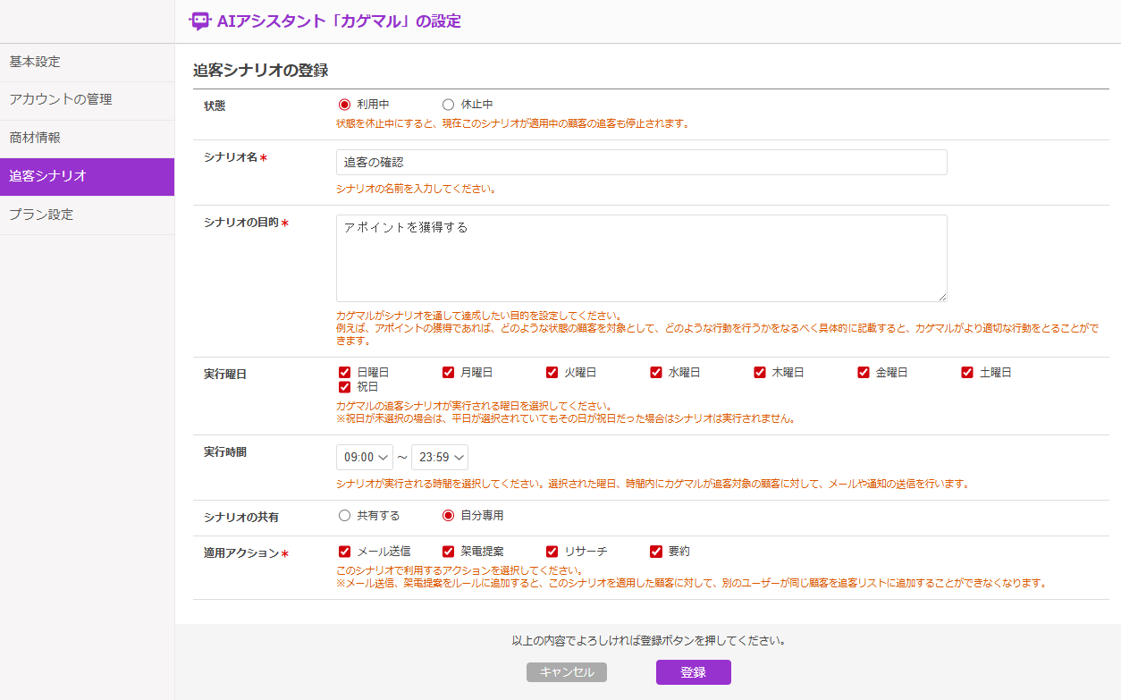 追客シナリオについては下記のマニュアルを参考ください。