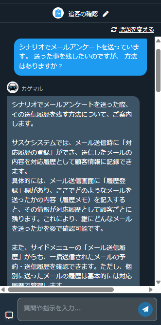 ここでは顧客に対する質問や指示は勿論のこと、サスケの使い方についても回答してくれます。